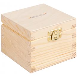 Solidna drewniana skarbonka z zatrzaskiem, wykonana z naturalnego drewna sosnowego. Idealna do bezpiecznego przechowywania drobnych, banknotów – świetny prezent edukacyjny.